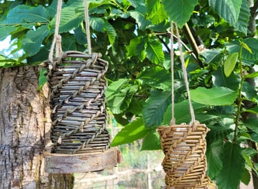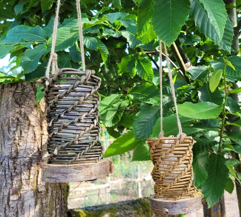 Une mangeoire pour les oiseaux, les graines passent a travers le tressage et les petits oiseaux peuvent s'agripper aux brins d'osier.